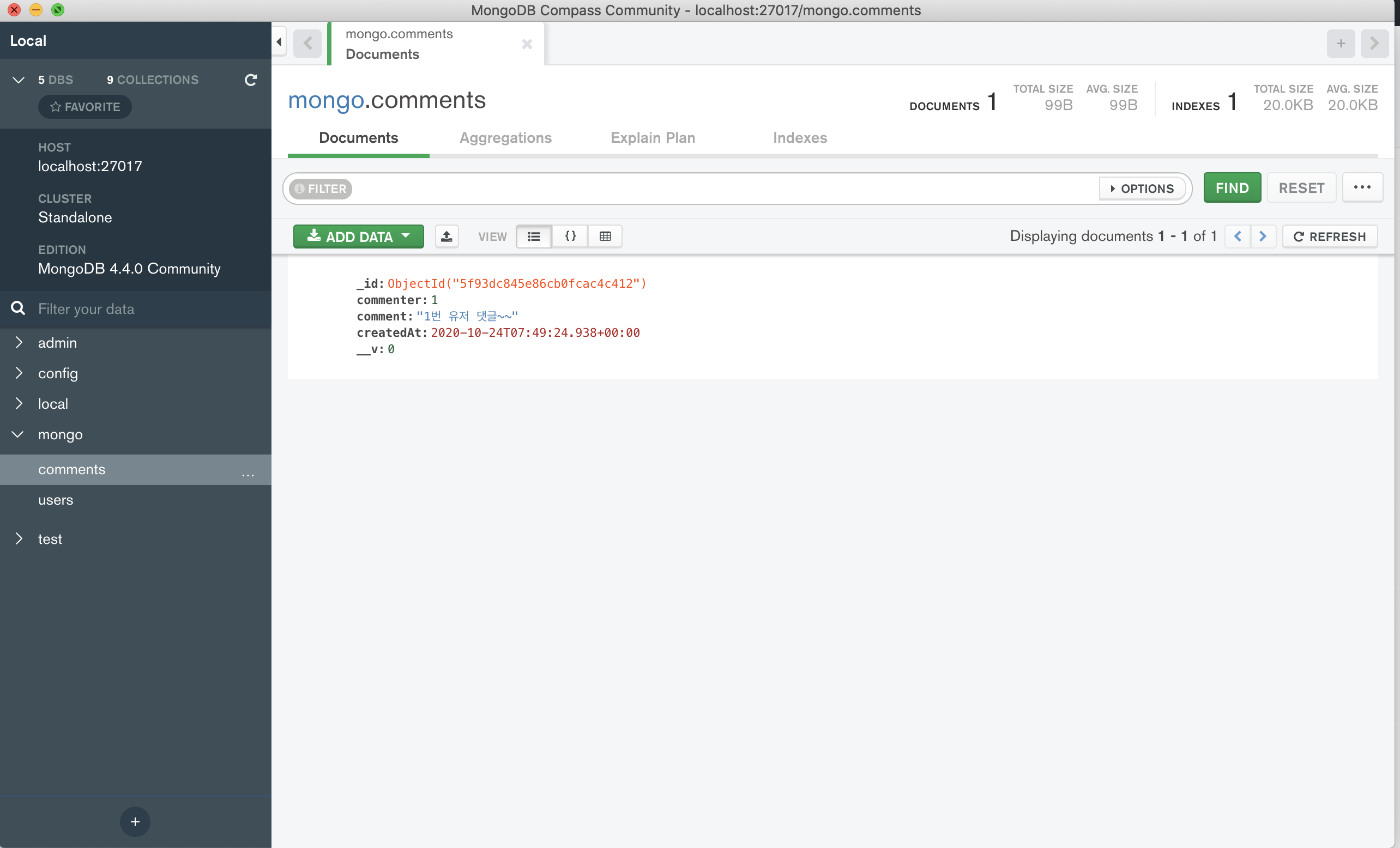 그리고 나서 사용자의 전체 댓글을 조회하는 API를 이용해서 PostMan으로 테스트해도 되지만 필자는 아래와 같이 MongDB Compass에서 제대로 데이터가 들어갔는지 확인을 해보았다.