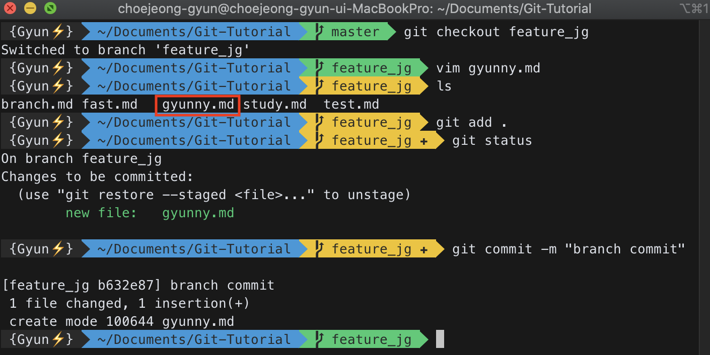 위와 같이 feature_jg 브랜치에서 gyunny.md 파일을 만들고 커밋까지 진행해보자. 그리고 feature_jg 브랜치에서 master 브랜치로 이동해보자.
