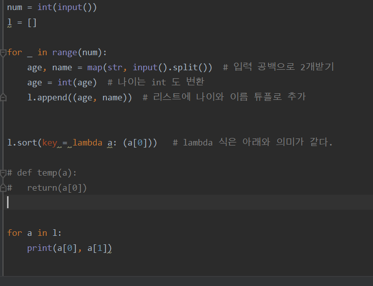 리스트 l 안에는 나이, 이름을 입력받은 튜플들이 존재한다. 그 튜플들이 하나씩 lambda 안에 a 로 들어와서 나이만 정렬이 되는 것이다.