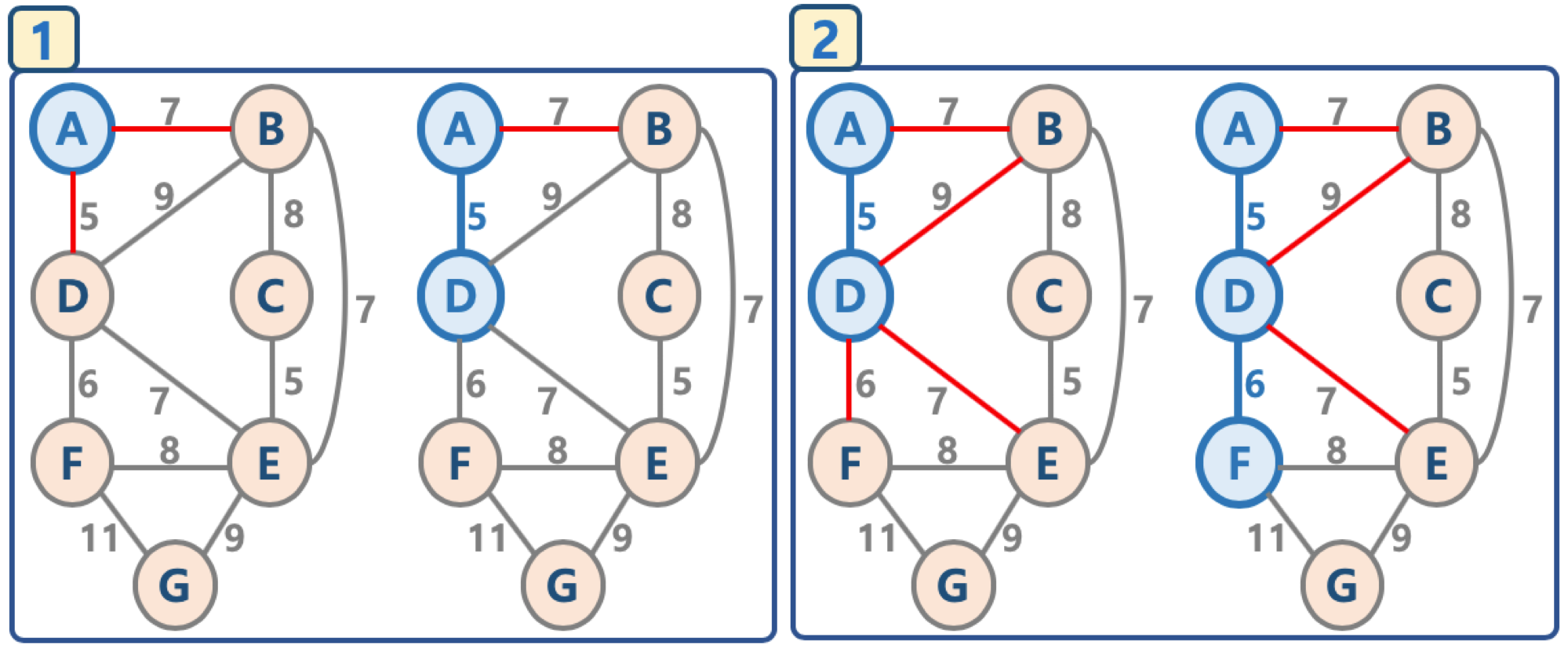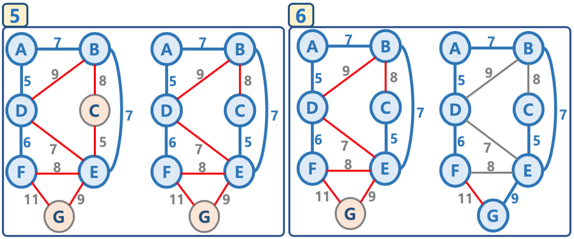 이 말이 조금 이해가 안될 수도 있다. 예를들어 그림 4번을 보자. B와 E의 간선 가중치 7을 선택한 후에 그 다음에 작은 간선 가중치인 DE가 존재한다. 하지만 DE는 양쪽 노드 '연결된 노드 집합'에 들어 있기 때문에 포함시키지 않는다는 뜻이다.