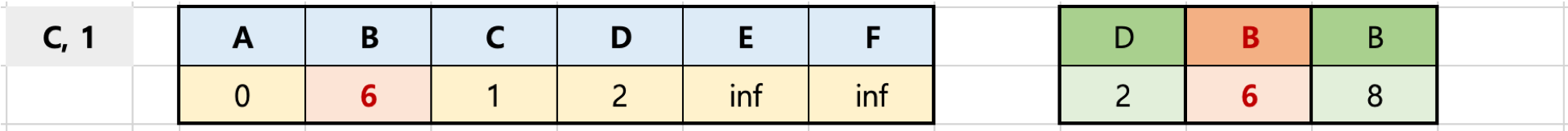 3단계: 우선순위 큐에서 거리가 가장 짧은 (C, 1)