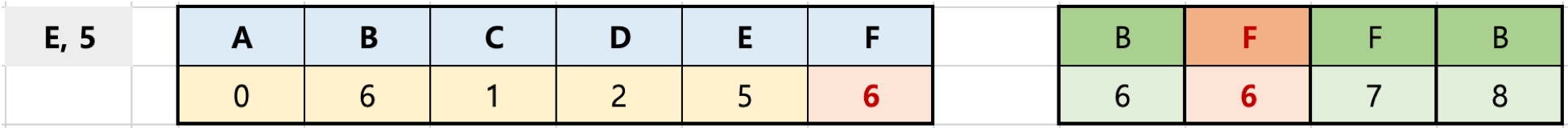 - A - E 거리가 5인 상태에서, E에 인접한 F를 가는 거리는 1이다. 즉 A - E - F 는 5 + 1 = 6, 현재 배열에 A - F 최단거리가 7로 기록되어 있으므로, (F, 6) 으로 업데이트