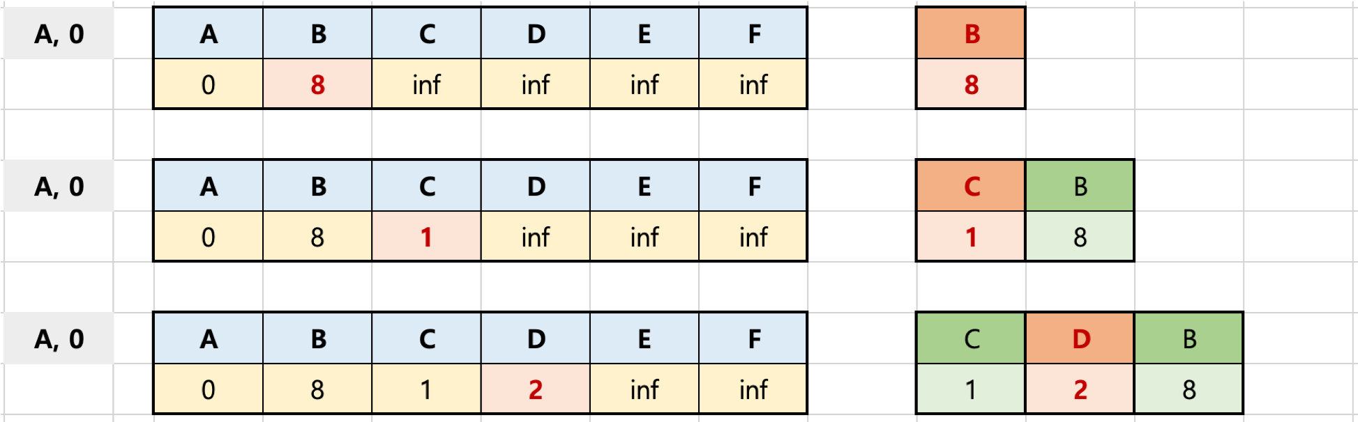 - 우선순위 큐가 MinHeap(최소 힙) 방식이므로, 위 표에서 넣어진 (C, 1), (D, 2), (B, 8) 중 (C, 1) 이 먼저 추출됨 (pop)