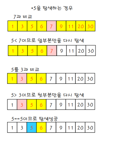 - 검색할 숫자 (search) < 중간값 이면, 앞 부분의 서브 리스트에서 검색할 숫자를 찾는다.