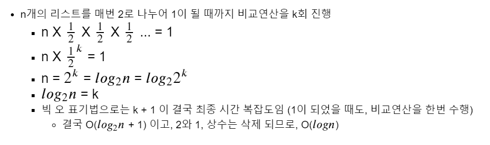 배열의 개수를 n이라고 할 때, 이진 탐색은 n이 1이 될 때 까지 반복한다. 따라서 위의 식처럼 진행되면 k = log2n이 되기 때문에 시간복잡도는 O(logn)이 된다.
