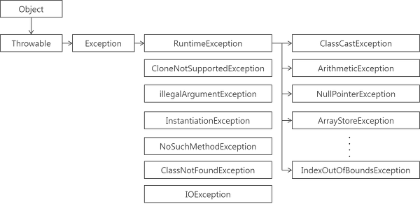 자바는 예외를 클래스로 만들어서 관리를 하고 전체 계층 구성도는 위와 같다.