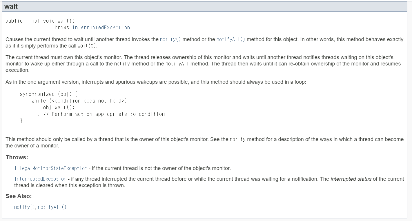 그렇기 때문에 wait()메소드에서 IllgalMonitorStateException을 처리해주지 않은 것이다.