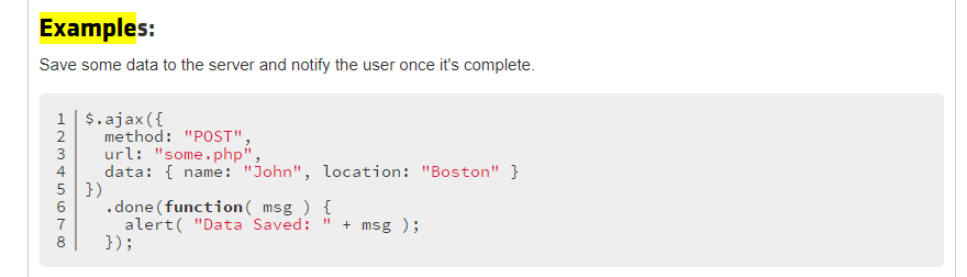 12345678910111213141516171819202122232425<!DOCTYPE html><html lang="en"><head><meta charset="UTF-8"><meta name="viewport" content="width=device-width, initial-scale=1.0"><meta http-equiv="X-UA-Compatible" content="ie=edge"><title>Document</title></head><body><script src="https://code.jquery.com/jquery-3.4.1.js"integrity="sha256-WpOohJOqMqqyKL9FccASB9O0KwACQJpFTUBLTYOVvVU=" crossorigin="anonymous"></script><script>$.ajax({method: "POST",url: "some.php",data: { name: "John", location: "Boston" }}).done(function (msg) {alert("Data Saved: " + msg);});</script></body></html>일단 코드를 그대로 복사 붙혀넣기를 하면 위와 같은 형태가 된다. 그리고 위의 코드를 간단하게 설명해보자면