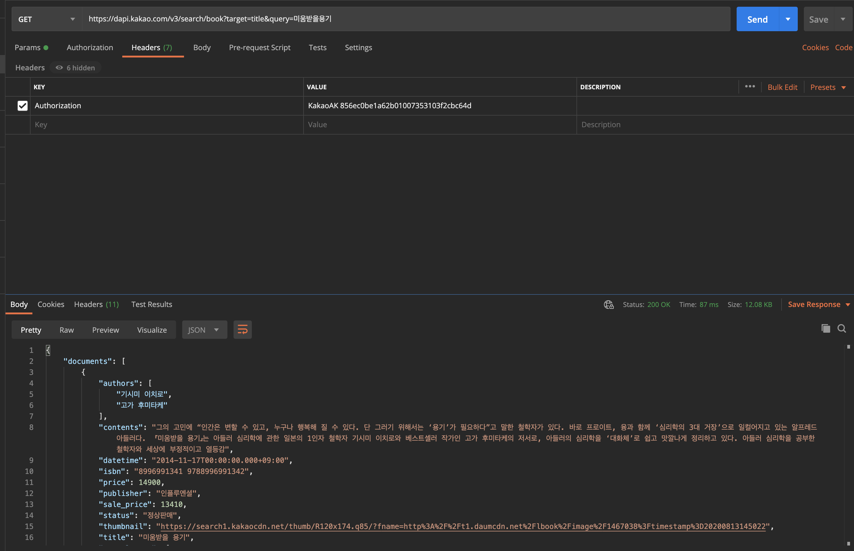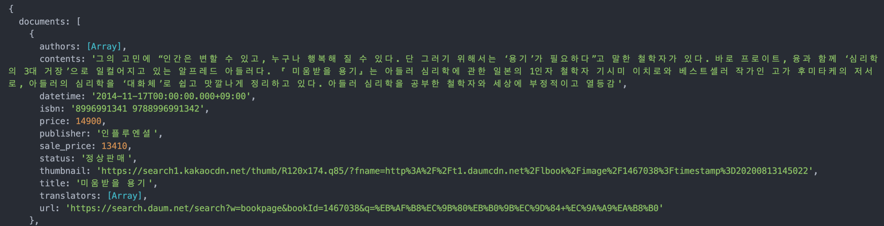 const express = require('express'); const router = express.Router(); const request = require('request'); let kakaoOptions = { url: 'https://dapi.kakao.com/v3/search/book?target=title', // target에 해당하는 것을 적기 method: 'GET', headers: { 'Authorization': 'KakaoAK (REST API KEY)' }, qs: { query : '미움받을용기' // 현재 책으로 검색할 것이라 책 제목을 적었다. }, encoding: 'UTF-8', } request(kakaoOptions, function (err, res, body) { if (!err && res.statusCode == 200) { console.log(JSON.parse(body)); } }) module.exports = router;위의 코드가 동작하는 원리에 대해서 설명하자면, 먼저 kakaoOptions에 요청할 URL을 적어주고(책 제목으로 검색할 예정이기 때문에 target=title 이라고 하였다), headers 안에는 KAKAO Develop 홈폐이지에서 발급받은 REST API 키 값을 적어주면 된다.