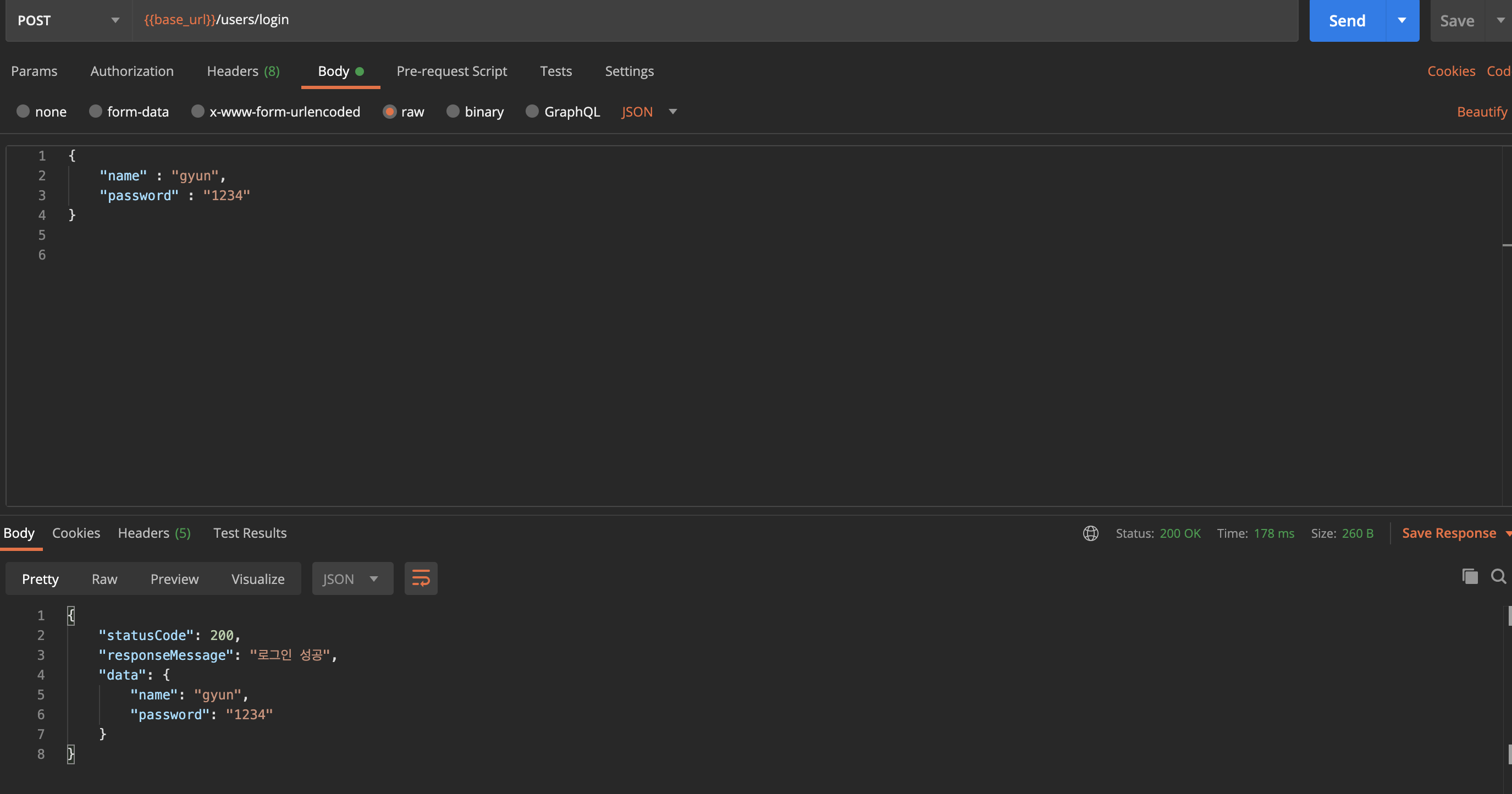 위와 같이 PostMan을 이용해서 Server에게 요청을 보냈을 때 응답이 잘 오는 것을 확인할 수 있다. 실제로는 위와같이 아이디, 비밀번호를 다시 돌려주는 일은 절대로 없겠지만 예제이기 때문에 한번 해보았다.