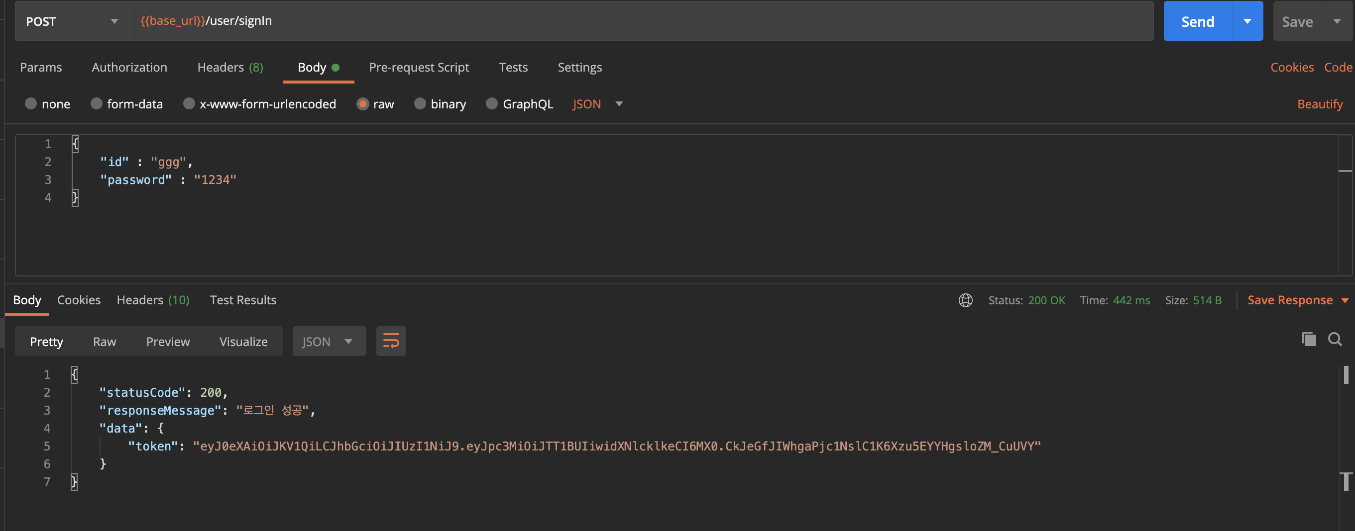 // 로그인 성공 if (passwordEncoder.matches(signInModel.getPassword(), user.getPassword())) { // 토큰 생성 final JwtService.TokenRes tokenDto = new JwtService.TokenRes(jwtService.create(user.getUserIdx())); return DefaultRes.res(StatusCode.OK, ResponseMessage.LOGIN_SUCCESS, tokenDto); }여기서 아까 위에서 설명했던 create() 메소드를 호출하여 토큰을 받아와 클라이언트에게 토큰을 반환해준다.