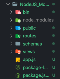 그러면 위와 같은 프로젝트 구조를 볼 수 있을 것이다. 그리고 몽고디비를 사용하기 위해서 schemas 패키지를 하나 만들어서 아래에 index.js users.js, comment.js를 만들어 넣자(유저, 댓글 API를 만들 예정이다)