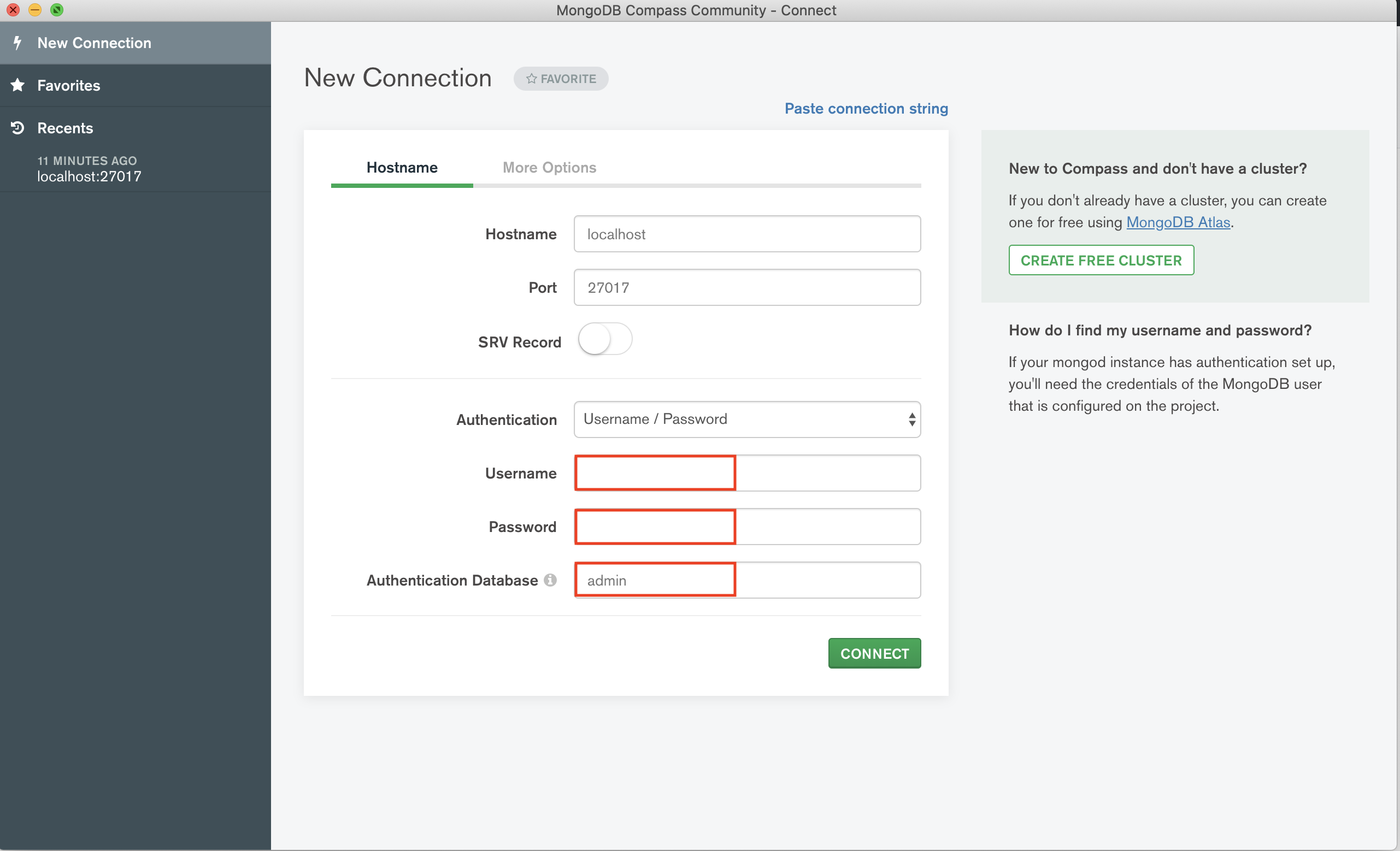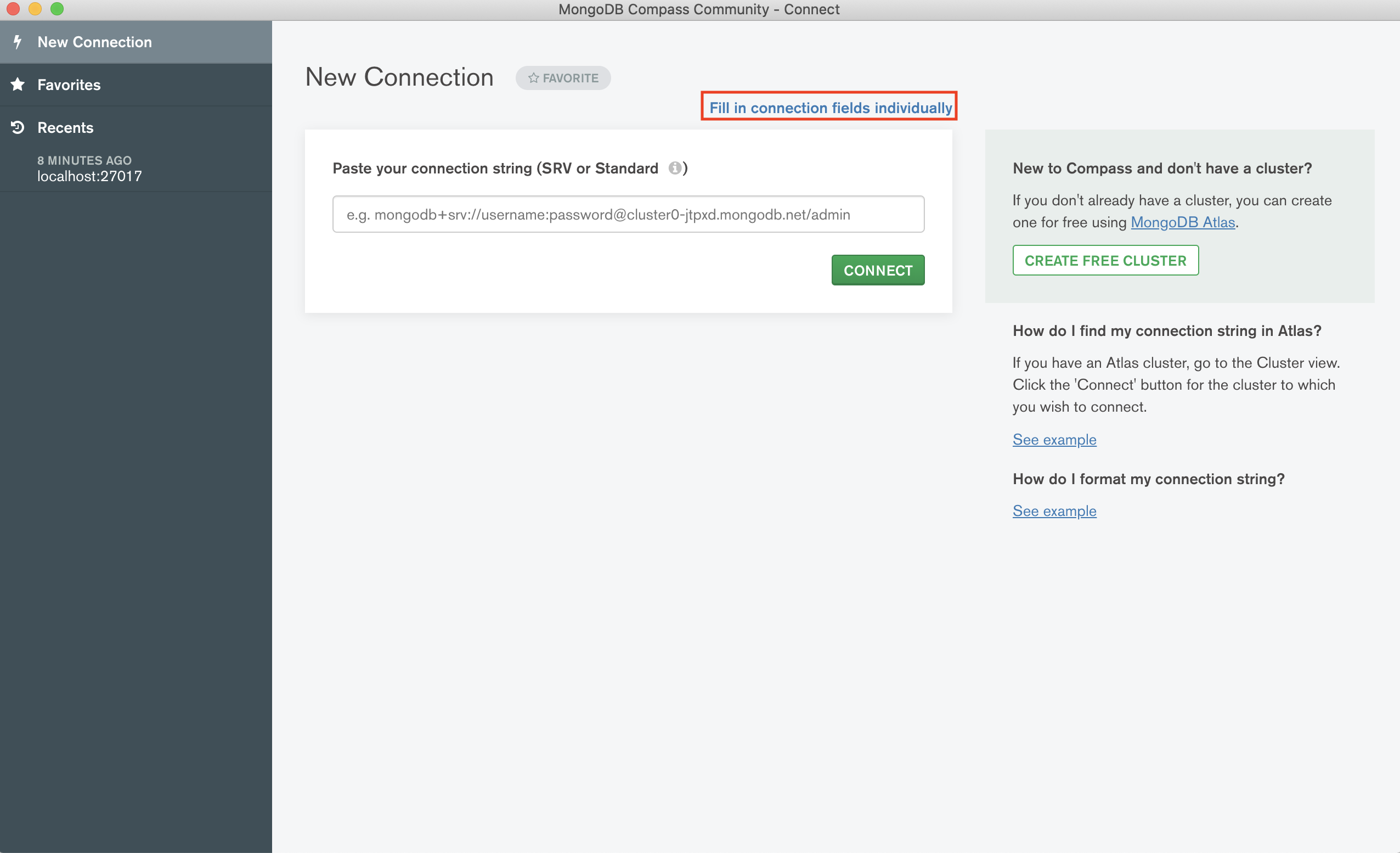 MongoDB Compass를 키면 아래와 같은 화면을 볼 수 있다.