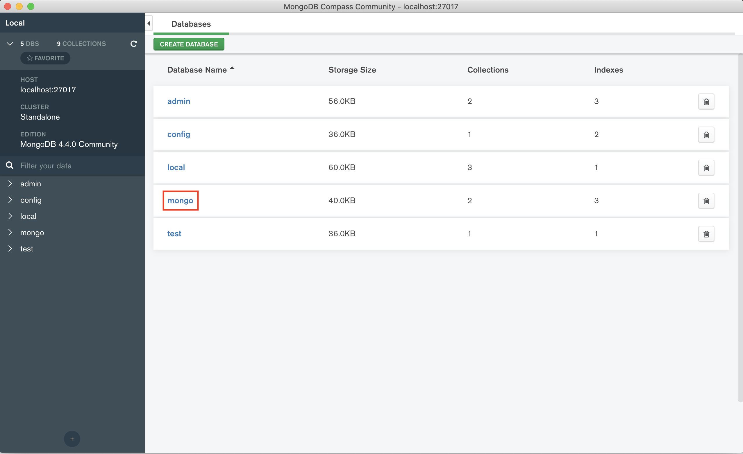 그러면 아래와 같이 자신이 설정했던 데이터베이스 이름이 만들어진 것을 확인할 수 있다(필자는 mongo라고 했다.)