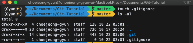 필자는 Git-Tutorial 디렉토리에서 touch 명령어를 통해 .gitignore 파일을 만들었다. 그리고 ls -al 명령어를 통해서 확인하면 만들어진 것도 확인할 수 있다.