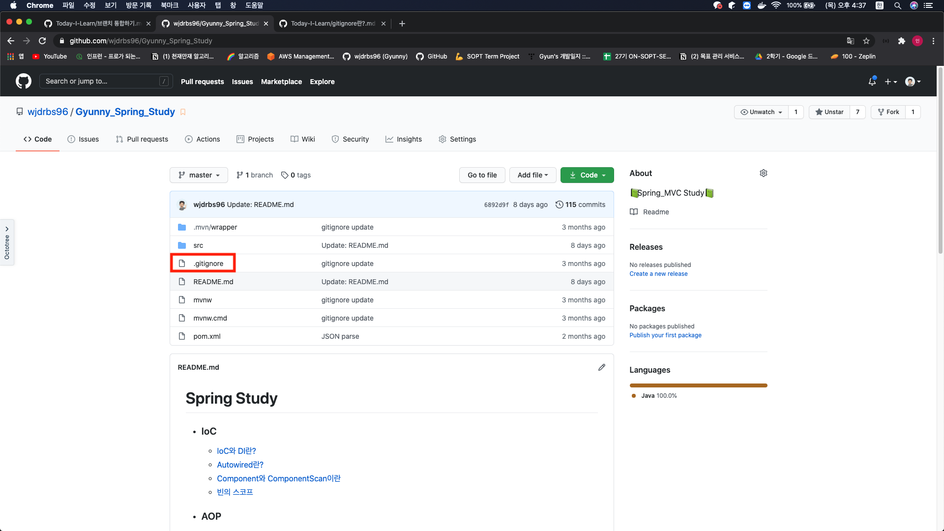 Github에서 Repository를 보다보면 위와 같이 .gitignore 파일을 본적이 있을 것이다. 이번 글에서는 .gitignore가 어떤 역할을 하는지에 대해서 정리해보려 한다.