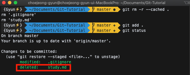 이미 원격저장소에 올라가 Git의 추적을 받고 있는 study.md 파일을 .gitignore에 적용시키려 해보자.