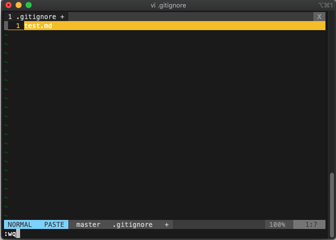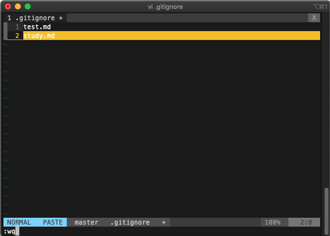 그리고 위와 같이 .gitignore에 Git의 추적(Track)을 받기를 원하지 않는 이름을 적어주면 된다. 위의 경우는 test.md 파일을 적었다.