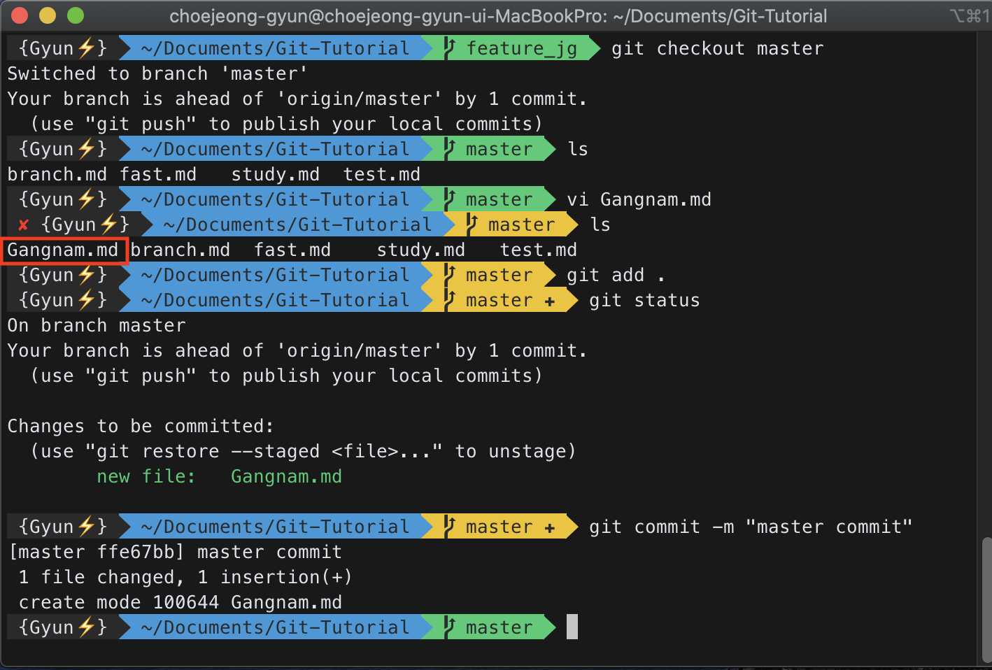 master 브랜치에는 Gangnam.md 파일을 만들고 여기서도 commit까지 진행해보자.