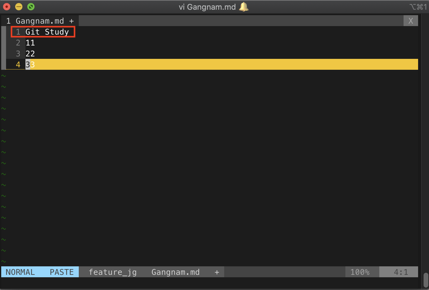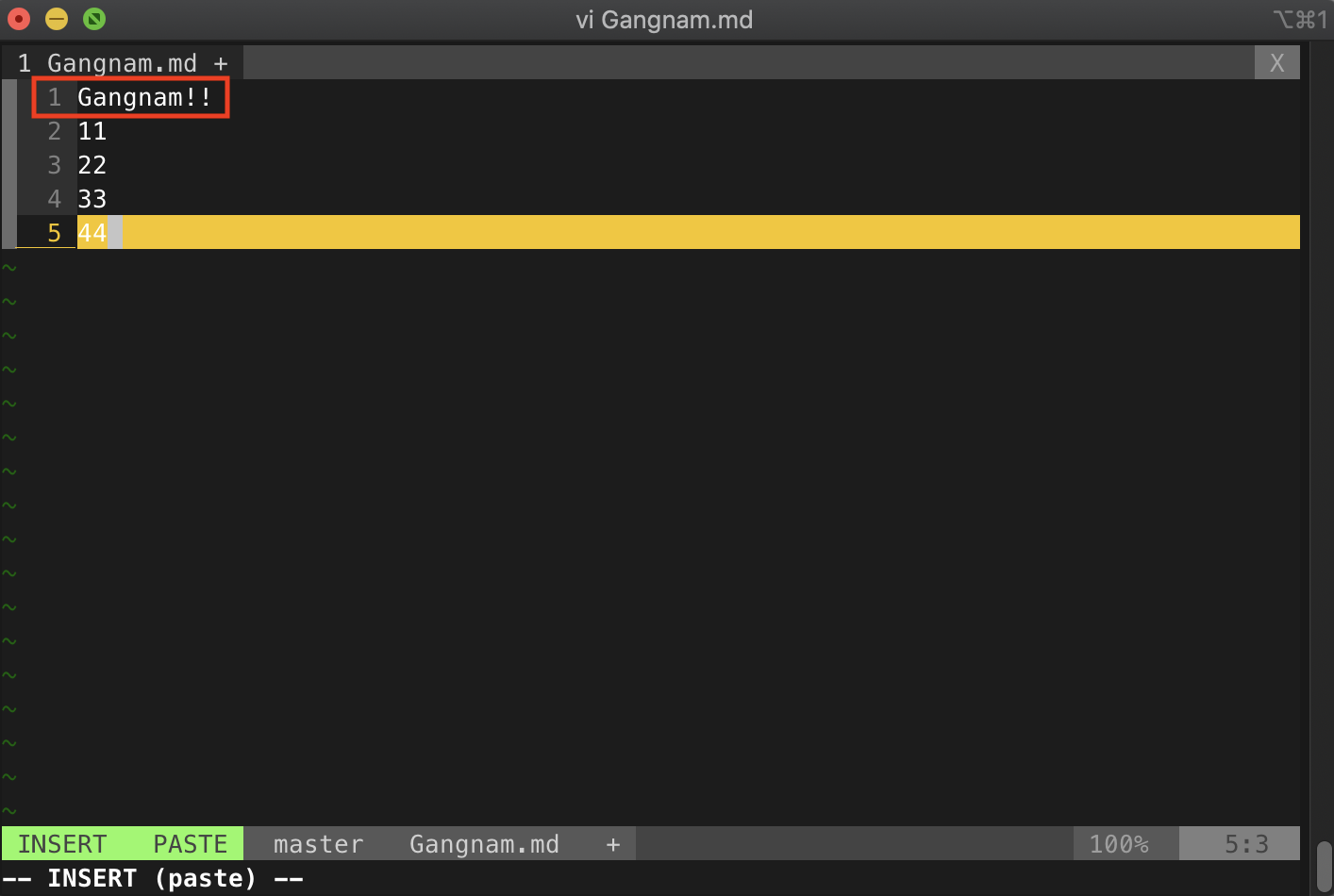 먼저 충돌을 강제로 발생시키기 위해서 master 브랜치에서 원하는 파일 하나를 수정해보자. 필자는 Gangnam.md 파일에서 첫 번째 줄의 내용을 수정했다.