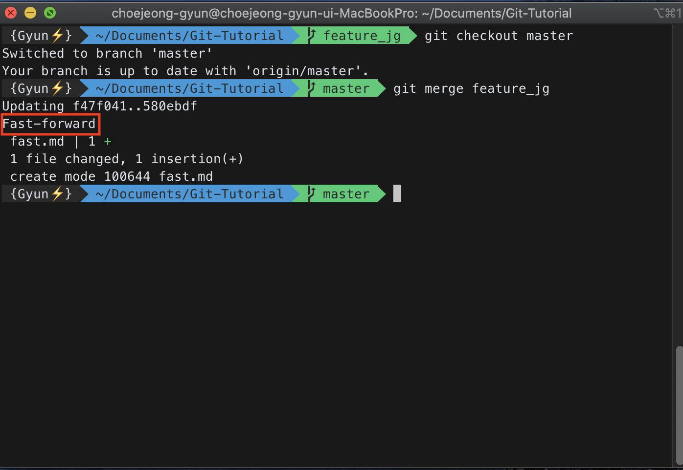 위와 같이 master 브랜치와 feature_jg 브랜치가 병합(Merge)가 되었을 때, Fast-forward가 뜨는 것을 볼 수 있다. 따라서 master 브랜치가 feature_jg 브랜치가 있는 곳까지 빨리감기를 한 상황이다.