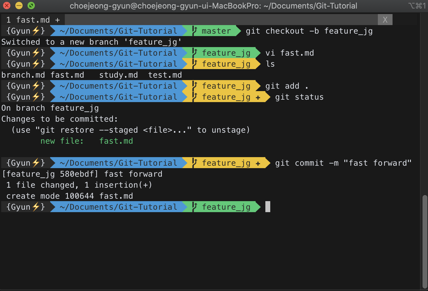 git checkout -b 옵션을 사용하면 브랜치를 만들면서 바로 이동할 수 있다. 그리고 새로 만든 브랜치에서 fast.md 파일을 만든 후에 커밋을 진행해보자.