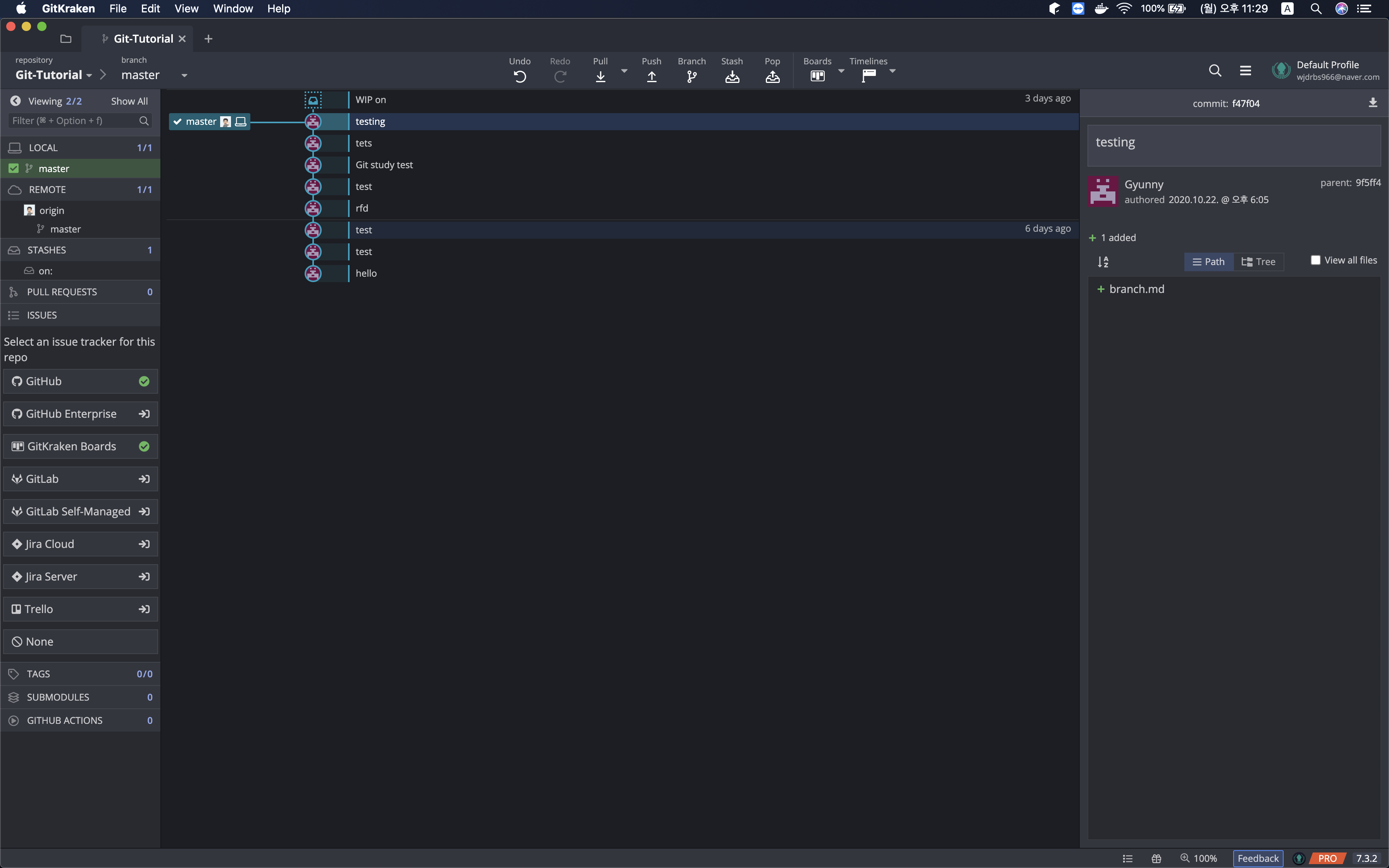그리고 GitKraken에서 확인을 해보면 이번에는 일자의 모양이 아닌 가지치는 모양으로 만들어진 것을 확인할 수 있다.