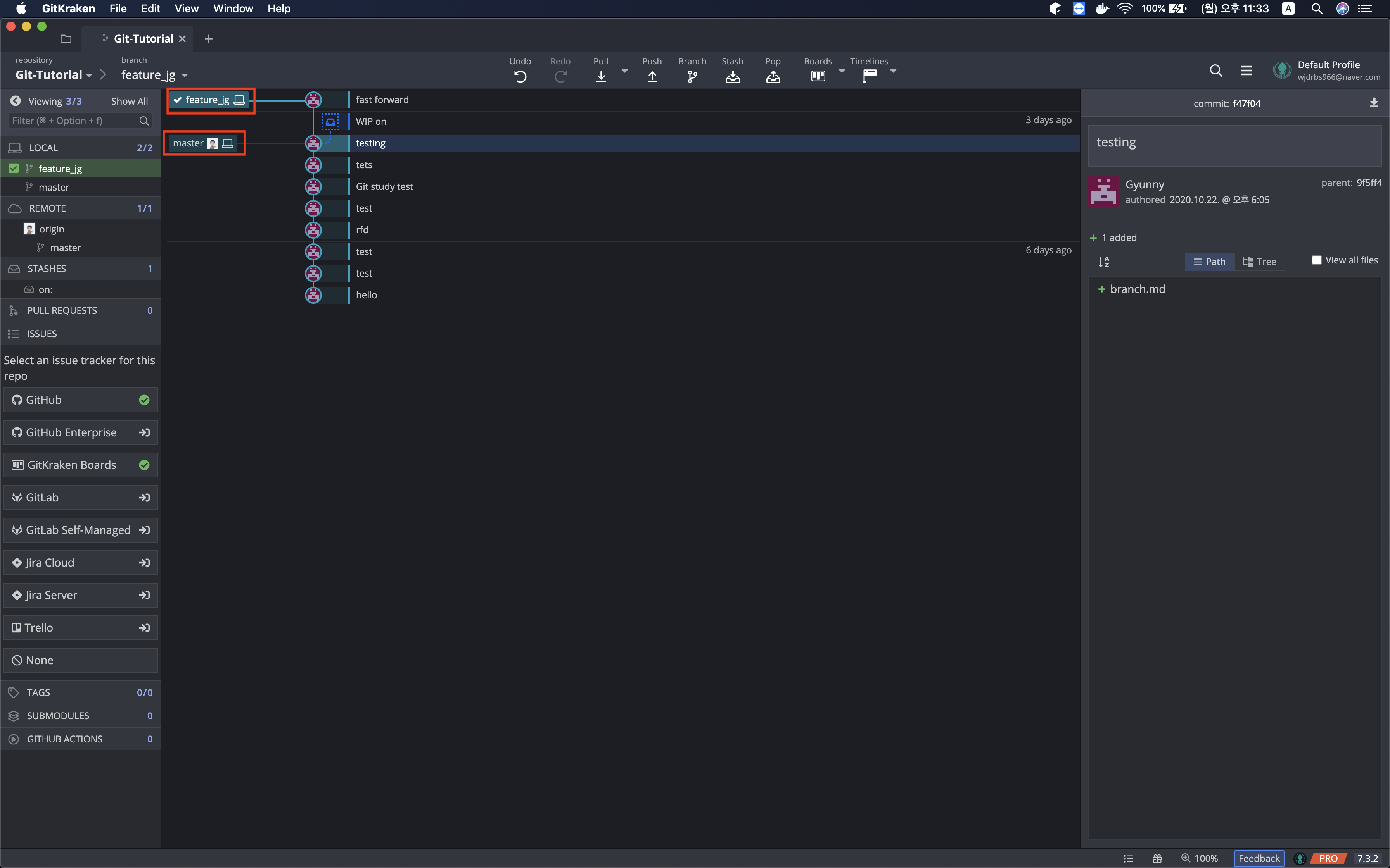 그리고 GitKraken을 통해서 확인해보면 위와 같이 master 브랜치와 feature_jg 브랜치가 생긴 것을 볼 수 있다. 그런데 일반적으로 생각하는 가지치는 모양이 아니라 일자로 되어 있다. (일자의 모양이라고 브랜치가 없다고 생각하면 안된다.)