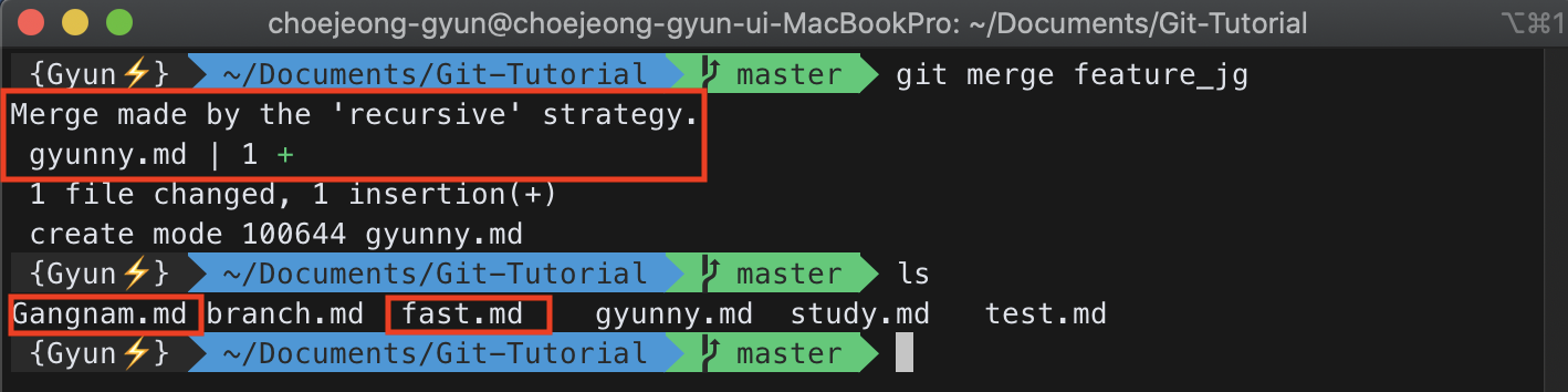 그러면 위와 같이 문제 없이 merge가 되었고 feature_jg 브랜치에서 만들었던 fast.md 파일도 master 브랜치에 존재하는 것을 볼 수 있다.