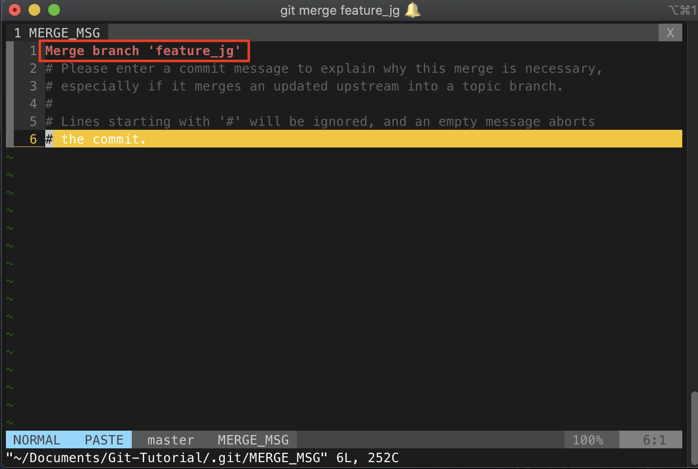 merge 명령어를 치면 위와 같은 화면을 볼 수 있다. Default commit message가 위와 같이 되어 있는데 원한다면 수정할 수 있다. 하지만 필자는 그대로 merge를 했다.