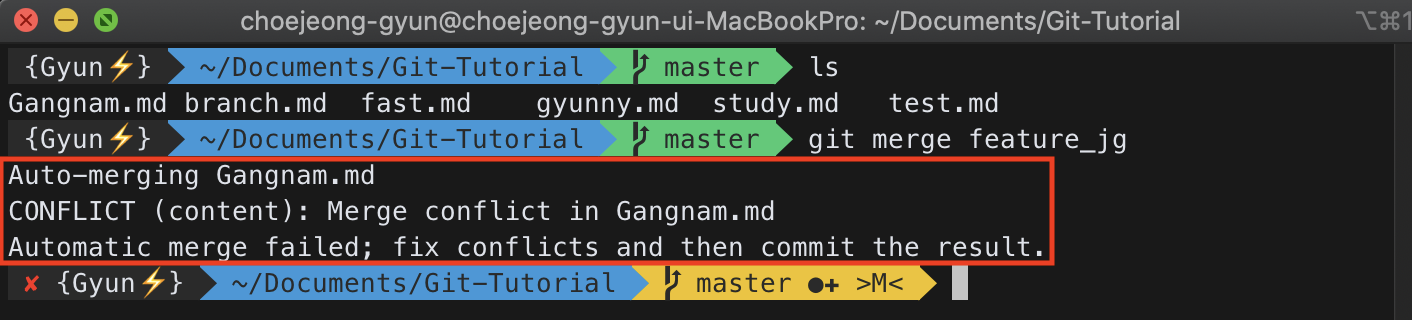 그리고 git merge를 해보면 위와 같이 충돌이 발생하는 것을 알 수 있다. 이렇게 같은 파일의 같은 내용을 두 개의 브랜치가 동시에 수정한다면 충돌이 발생하게 된다.