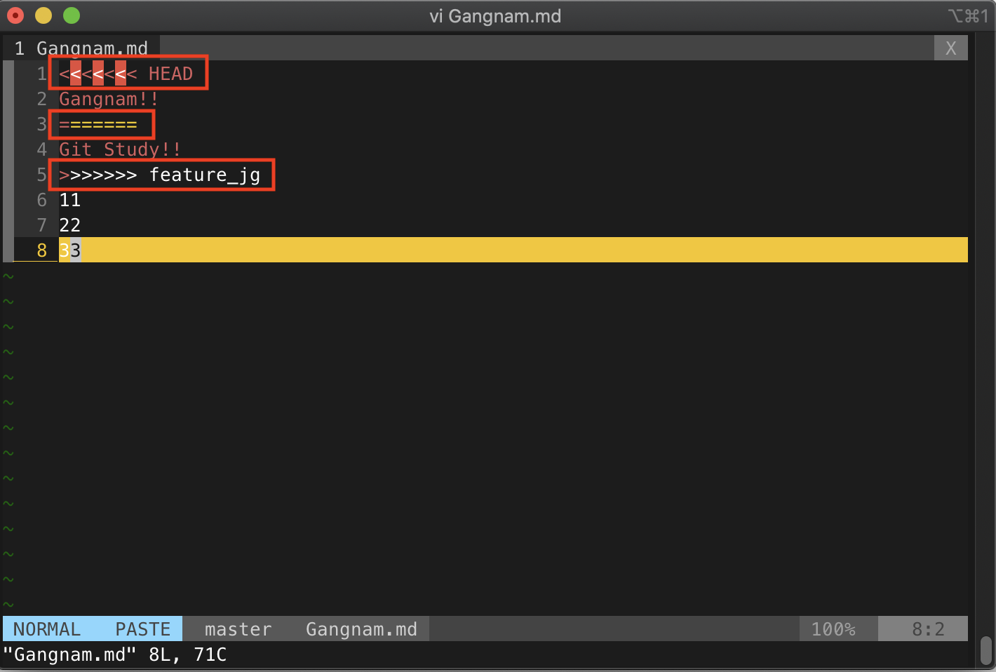 그리고 Gangnam.md 파일을 보면 위와 같이 되어 있을 것이다. 충돌이 일어난 부분을 표시해주는 것이다.