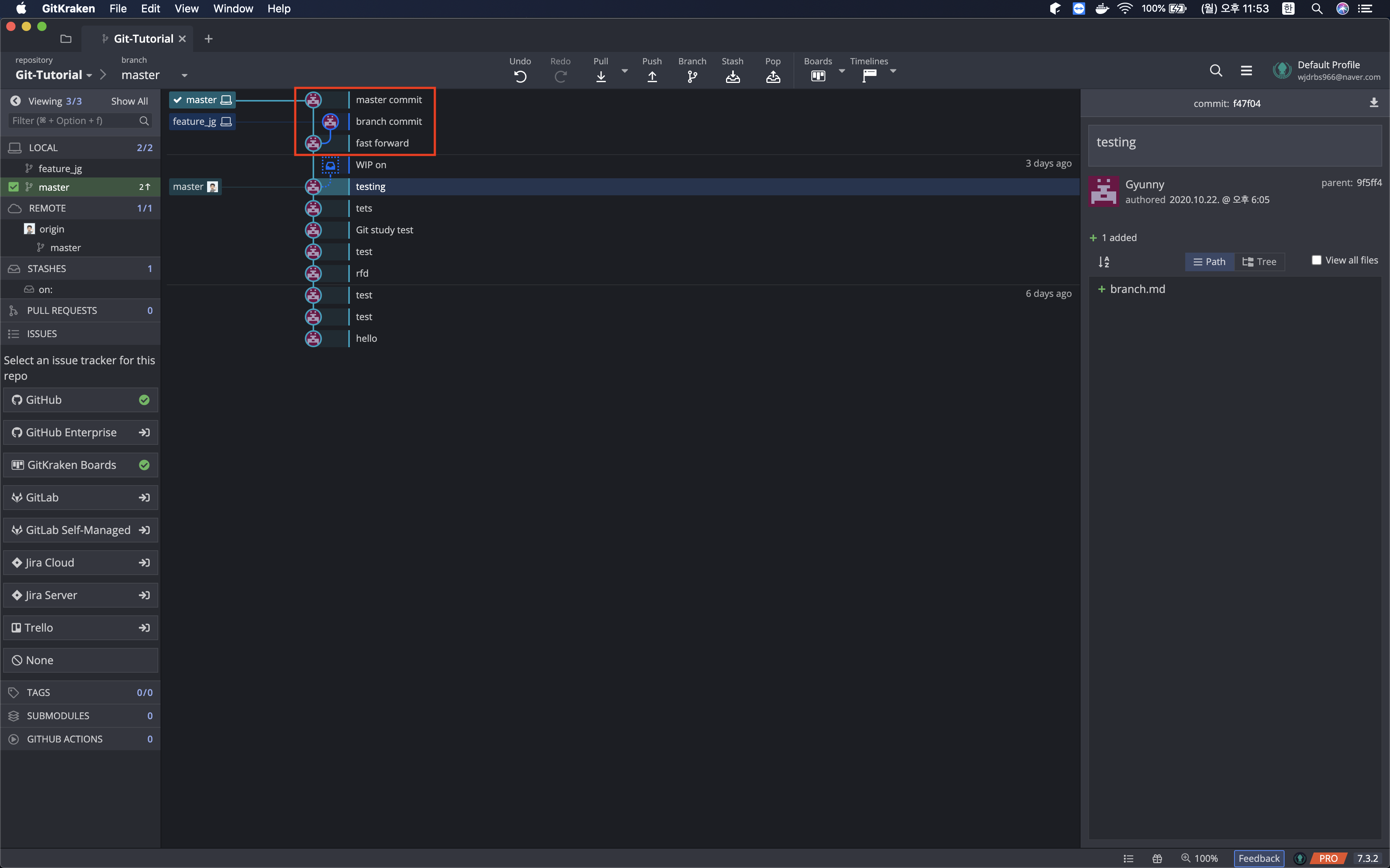 빨리 감기(fast-forward) 병합을 GitKraken과 CLI를 이용해서 실습을 해보자.
