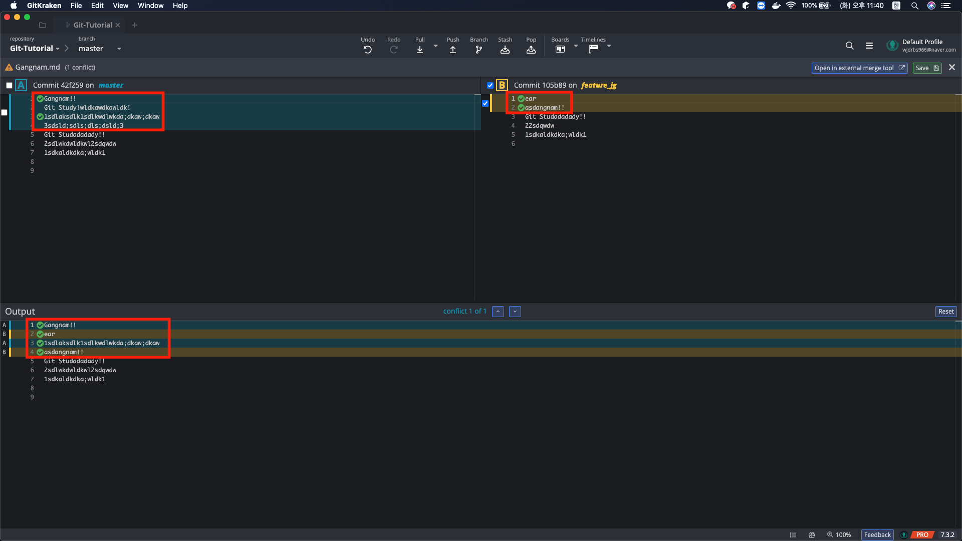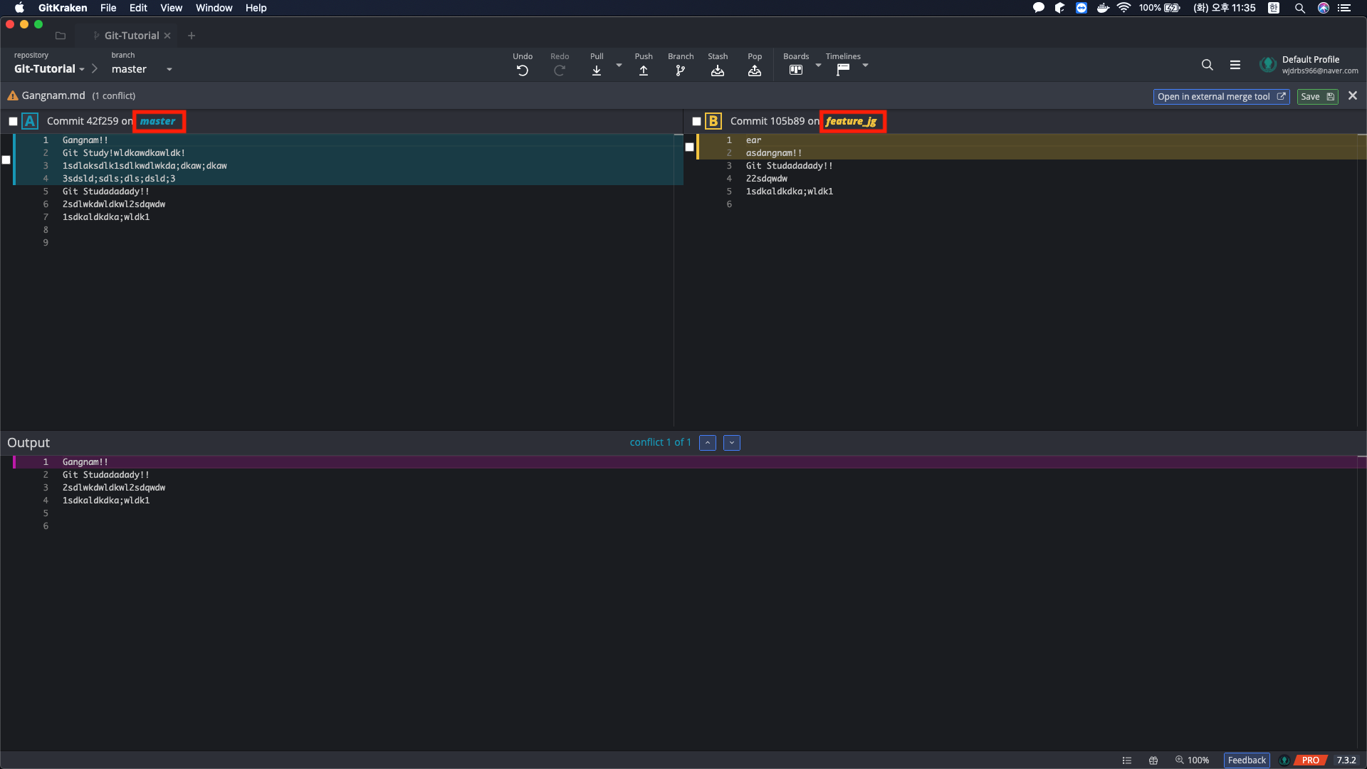 그러면 위와 같이 master 브랜치의 파일에서 충돌이 일어난 부분을 표시해주고, feature_jg 브랜치의 파일에서 충돌이 일어난 부분도 표시해준다. 그리고 아래의 Output은 원래 원본 파일의 내용이다.