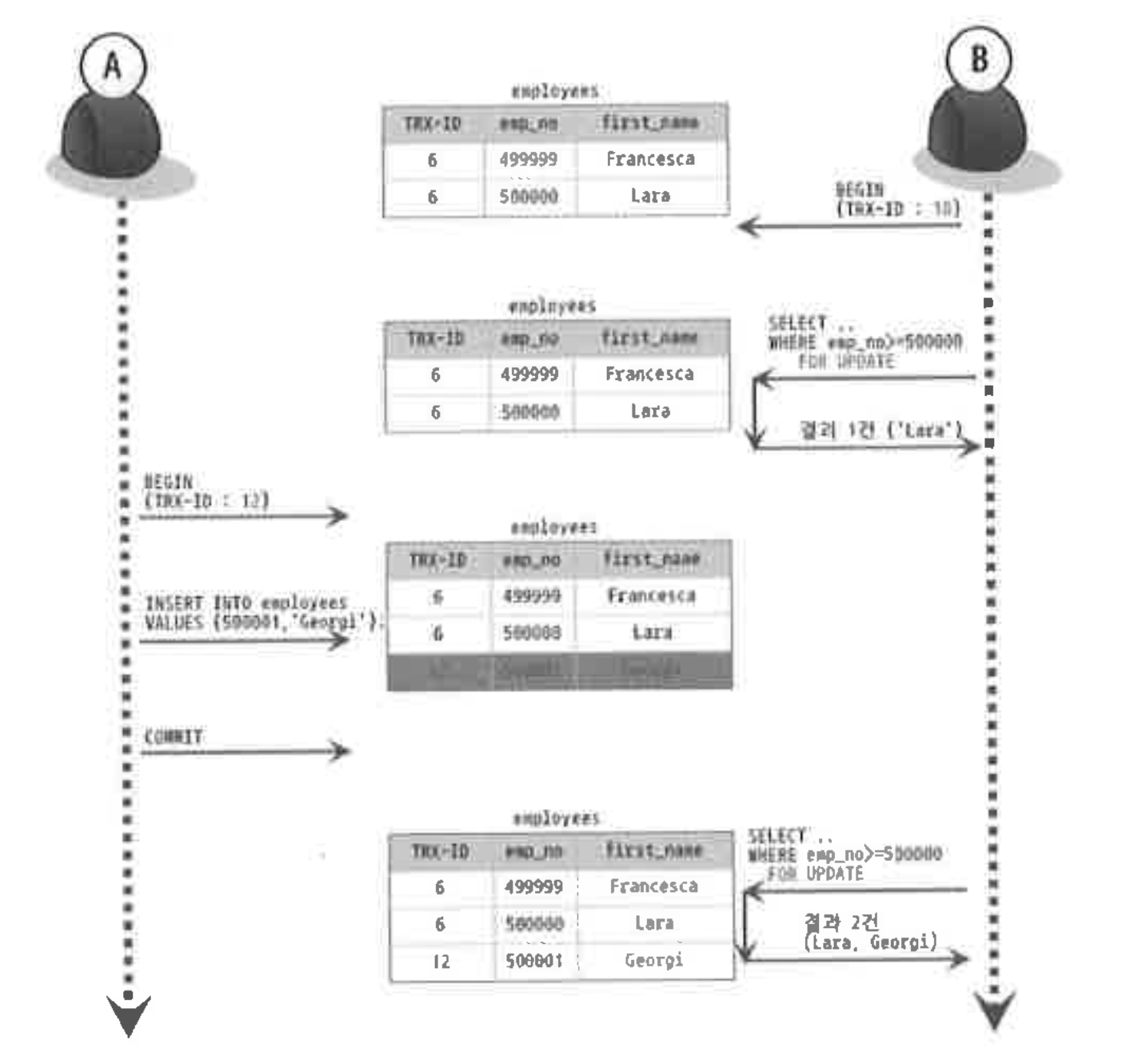 Toto로 변경하고 커밋을 했는데요. 이 때 사용자 B는 emp_no=500000인 사람을 커밋 전후로 SELECT 한 것을 볼 수 있습니다. 그런데 같은 결과를 반환받고 있는데요. 즉, 사용자 B가 BEGIN을 통해 트랜잭션 ID 10번을 받고, 트랜잭션 10번 안에서 실행되는 모든 SELECT 쿼리는 트랜잭션 번호가 10(자신의 트랜잭션 번호) 보다 작은 트랜잭션 번호에서 변경한 것만 보게 되는 것입니다.REPEATABLE READ 부정합REPEATABLE READ 격리 수준에서도 부정합이 발생할 수 있습니다. 아래는 사용자 A가 employees 테이블에 INSERT를 실행하는 도중에 사용자 B가 SELECT ... FOR UPDATE 쿼리로 employees 테이블을 조회했을 때 어떤 결과를 나타내는지에 대한 그림입니다.
