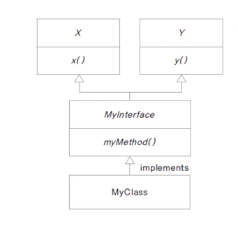 예를들어 X, Y 라는 인터페이스가 존재하고 이를 상속받는 MyInterface 도 존재한다고 가정하자. MyInterface를 구현 할 클래스인 MyClass도 존재한다.