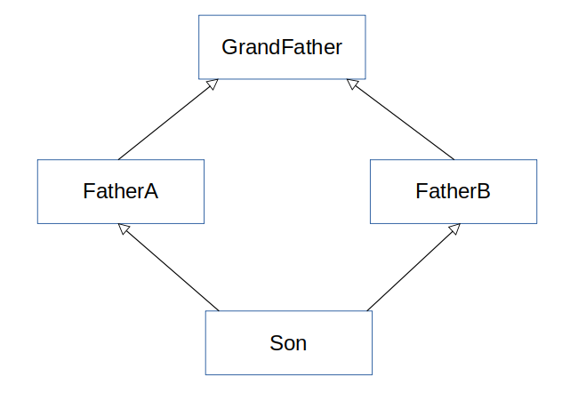 위와 같은 구조가 있다고 가정해보자. GrandFather 에 A() 라는 메소드가 있어서 FatherA 와 FatherB 에서 오버라이딩 해서 구현 했다고 생각해보자. 이러면 Son 입장에서는 A() 메소드를 호출 했을 때 누구의 메소드를 가져다 써야 할지 정할 수 없다. 따라서 컴파일도 되지 않는다.