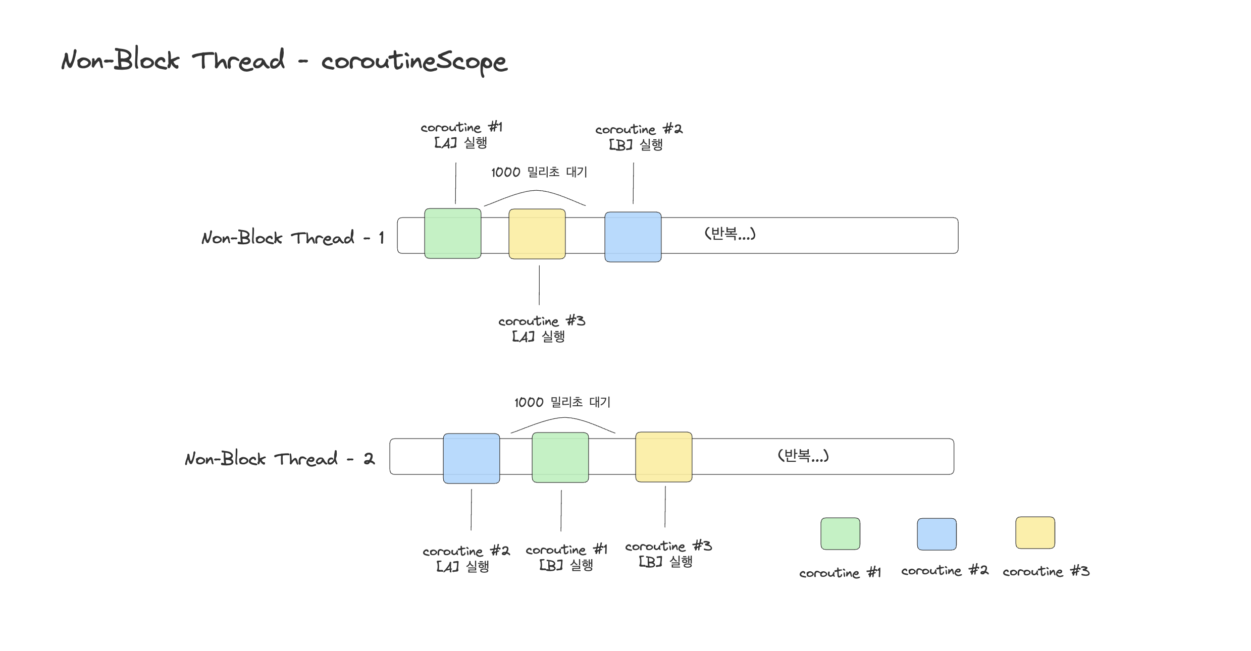 runBlocking vs coroutineScope을 사용해서 하나의 예시를 더 확인 해보겠습니다.예제 코드private val context = Executors.newFixedThreadPool(2).asCoroutineDispatcher() fun main() { runBlocking { blockingExample() println("***************************************************") nonBlockingExample() } } suspend fun blockingExample() = runBlocking { repeat(5) { index -> launch(context) { runBlocking { println("[A] Blocking coroutine $index started on ${Thread.currentThread().name}") delay(1000) println("[B] Blocking coroutine $index finished on ${Thread.currentThread().name}") } } } } suspend fun nonBlockingExample() = runBlocking { repeat(5) { index -> launch(context) { coroutineScope { println("[A] Non-blocking coroutine $index started on ${Thread.currentThread().name}") delay(1000) println("[B] Non-blocking coroutine $index finished on ${Thread.currentThread().name}") } } } }[A] Blocking coroutine 0 started on pool-1-thread-1 @coroutine#5 [A] Blocking coroutine 1 started on pool-1-thread-2 @coroutine#9 [B] Blocking coroutine 0 finished on pool-1-thread-1 @coroutine#5 [A] Blocking coroutine 2 started on pool-1-thread-1 @coroutine#10 [B] Blocking coroutine 1 finished on pool-1-thread-2 @coroutine#9 [A] Blocking coroutine 3 started on pool-1-thread-2 @coroutine#11 [B] Blocking coroutine 2 finished on pool-1-thread-1 @coroutine#10 [B] Blocking coroutine 3 finished on pool-1-thread-2 @coroutine#11 [A] Blocking coroutine 4 started on pool-1-thread-1 @coroutine#12 [B] Blocking coroutine 4 finished on pool-1-thread-1 @coroutine#12 *************************************************** [A] Non-blocking coroutine 1 started on pool-1-thread-1 @coroutine#15 [A] Non-blocking coroutine 0 started on pool-1-thread-2 @coroutine#14 [A] Non-blocking coroutine 2 started on pool-1-thread-2 @coroutine#16 [A] Non-blocking coroutine 3 started on pool-1-thread-1 @coroutine#17 [A] Non-blocking coroutine 4 started on pool-1-thread-2 @coroutine#18 [B] Non-blocking coroutine 1 finished on pool-1-thread-1 @coroutine#15 [B] Non-blocking coroutine 0 finished on pool-1-thread-2 @coroutine#14 [B] Non-blocking coroutine 2 finished on pool-1-thread-1 @coroutine#16 [B] Non-blocking coroutine 3 finished on pool-1-thread-2 @coroutine#17 [B] Non-blocking coroutine 4 finished on pool-1-thread-1 @coroutine#18위의 코드는 2개의 쓰레드에서 Blocking(runBlocking), Non-Blocking(coroutineScope) 으로 동작하도록 코드를 작성한 것입니다.
