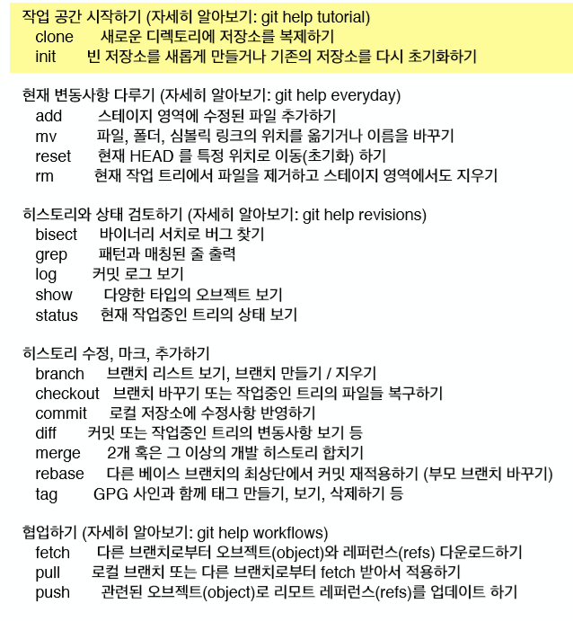 한번 쭉 보면 되지만, 일단 나는 clone, init, add, log, status, branch, checkout, commit, diff, merge, pull, push 이정도만 가볍게 공부를 해보려 한다.