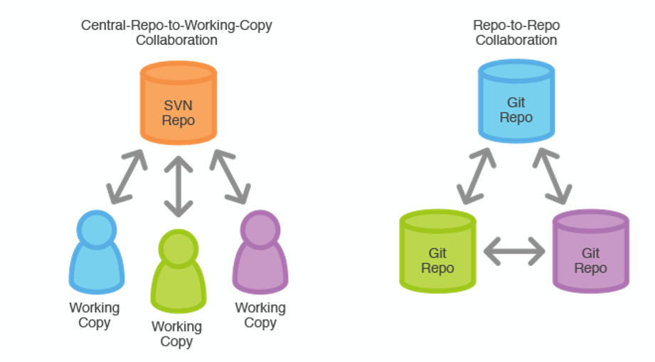 SVN( SVN(Subversion) 과 간단히 비교를 해보자. 서브버전의 경우 하나의 중앙 저장소가 있고, Git 의 경우에는 원격 저장소와 로컬 저장소가 있다.