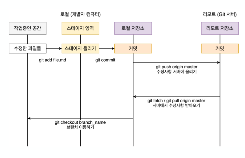 내 컴퓨터 ----------> 스테이지 영역 ----------> 로컬 저장소 ----------> 원격 저장소