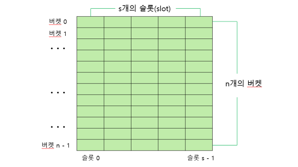 출처 : https://mattlee.tistory.com/62 위의 그림에서 볼 수 있듯이 하나의 버킷은 s개의 슬롯(slot)을 가질 수 있으며 하나의 슬록에는 하나의 항목이 저장됨