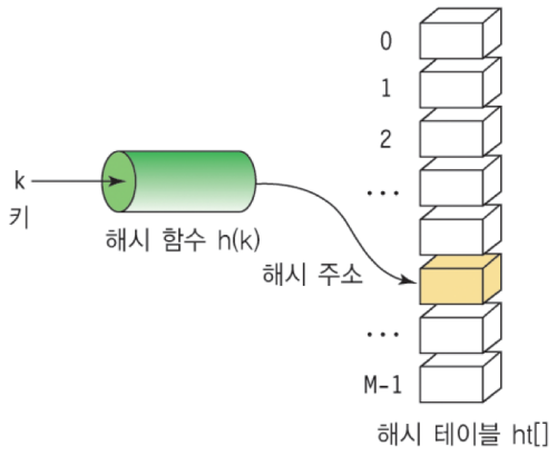 해시 함수 : 키를 입력으로 받아 해시 주소(hash address)를 생성하고 이 해시 주소를 해시 테이블(hash table)의 인덱스로 사용