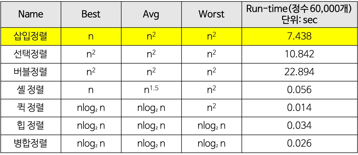 - 안정한 정렬 방법으로서 레코드의 수가 적을 경우 알고리즘 자체가 매우 간단하다.