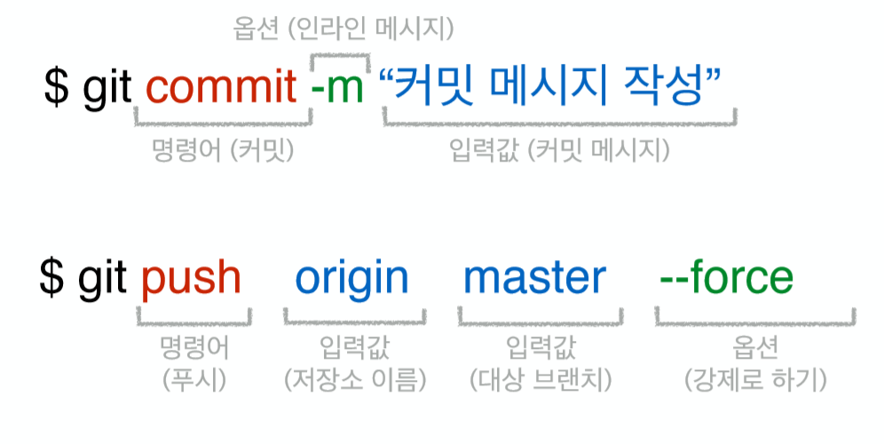 CLI 환경에서의 git 기본 사용 명령어 틀이다. 앞으로 다루게 될 기본 명령어들은 위와 같은 틀에서 크게 벗어나지 않을 것이다.