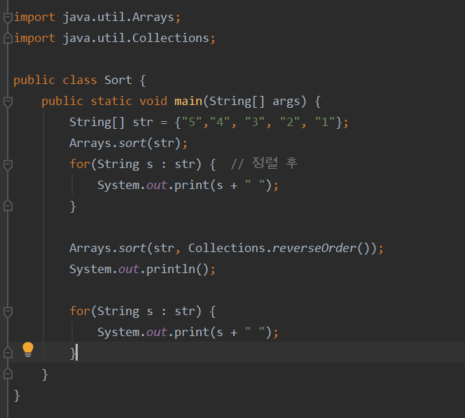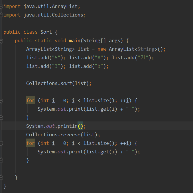 위의 코드와 같이, Collections를 import한 후에 sort() = 오름차순 와 reverse() = 내림차순을 사용하면 된다