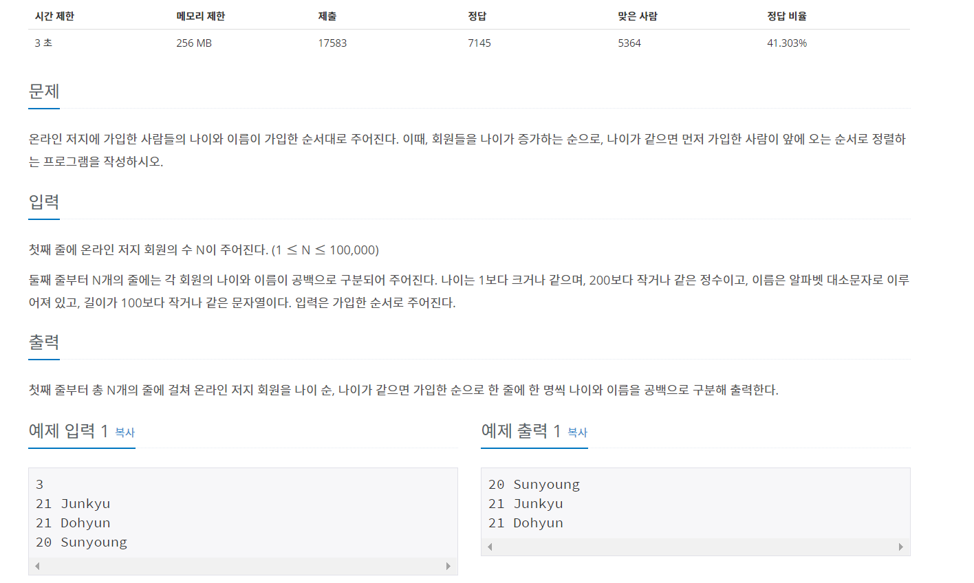 문제를 보자마자 되게 쉬울거 같다고 생각하고 바로 풀기 시작했다. 그냥 나이를 sort() 시키면 끝이네? 라고 생각 했지만 이렇게 문제를 풀면 내가 생각한 테스트케이스를 통과하지 못한다. 그것은 나이가 같은 사람이 입력되었을 때이다. 나이가 같으면 입력 순서대로 나와야하지만 순서대로 나오지 않아서 처음에 틀렸다. 그래서 알고리즘 문제에 익숙하지 않은 나는 그냥 버블정렬 비슷하게 이용해서 풀어야겠다 라고 생각하고 풀었는데 결과는 제대로 나온다. 하지만 시간초과가 계속뜬다. ㅠㅠ 그래서 결국 구글에 검색해서 찾아보게 되었다.