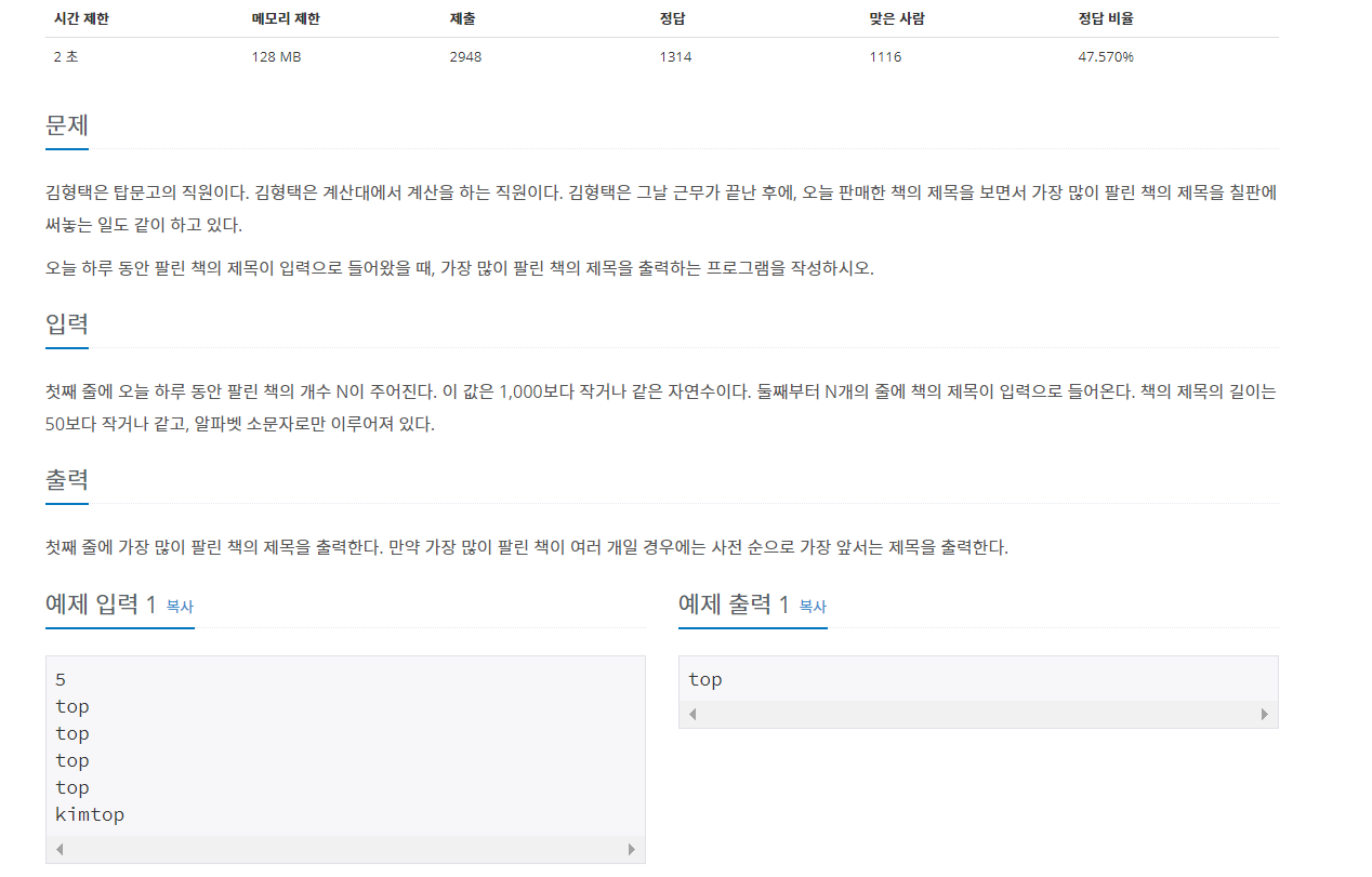 1234567891011121314151617181920212223242526272829303132333435363738394041424344import java.util.ArrayList;import java.util.Collections;import java.util.HashMap;import java.util.Scanner;public class BestSeller {public static void main(String[] args) {Scanner input = new Scanner(System.in);HashMap<String,Integer> hm = new HashMap<>();int n = input.nextInt();for (int i = 0; i < n; ++i) {String book = input.next();if (!hm.containsKey(book)) {hm.put(book, 1);}else {hm.put(book, hm.get(book) + 1);}}int max = 0;for(String a : hm.keySet()){max = Math.max(max, hm.get(a));}ArrayList<String> list = new ArrayList<>(hm.keySet());Collections.sort(list);for (String a : list) {if (hm.get(a) == max) {System.out.println(a);break;}}}}자바는 확실히 파이썬보다 훨씬 구현이 까다롭다고 느꼈다.. HashMap과 ArrayList를 이용해서 풀었다.