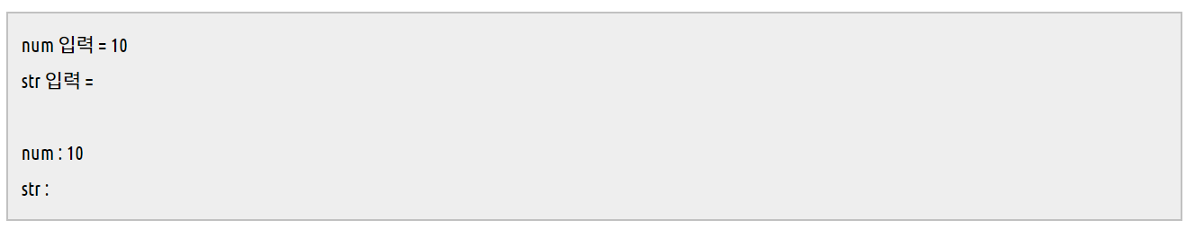 123456789101112131415161718192021import java.util.Scanner;public class Test {public static void main(String[] args) {Scanner input = new Scanner(System.in);int num;String str;System.out.println("num입력");num = input.nextInt();System.out.println("str입력");str = input.nextLine();System.out.println("num : " + num);System.out.println("str : " + str);input.close();}}s 출처 : https://sleepyeyes.tistory.com/22 원래 원했던 입력은 숫자1번, 문자1번 이었을 것이지만, 숫자1번 입력하면 바로 자동으로 출력이 된다.