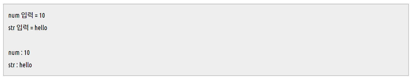 12345678910111213141516171819import java.util.Scanner;public class Test {public static void main(String[] args) {Scanner input = new Scanner(System.in);int num;String str;System.out.println("num입력");num = input.nextInt();System.out.println("str입력");str = input.next();System.out.println("num : " + num);System.out.println("str : " + str);input.close();}}
